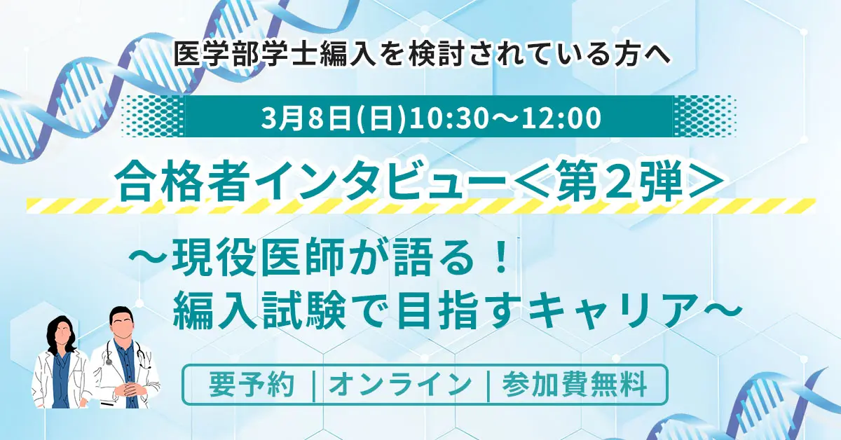 2026年春オンライン特別企画の合格者インタビュー<第2弾>。編入試験を経て医師として活躍する現役医師2名を迎え、講師アテンドのもと大学生活や卒後のキャリアについて...
